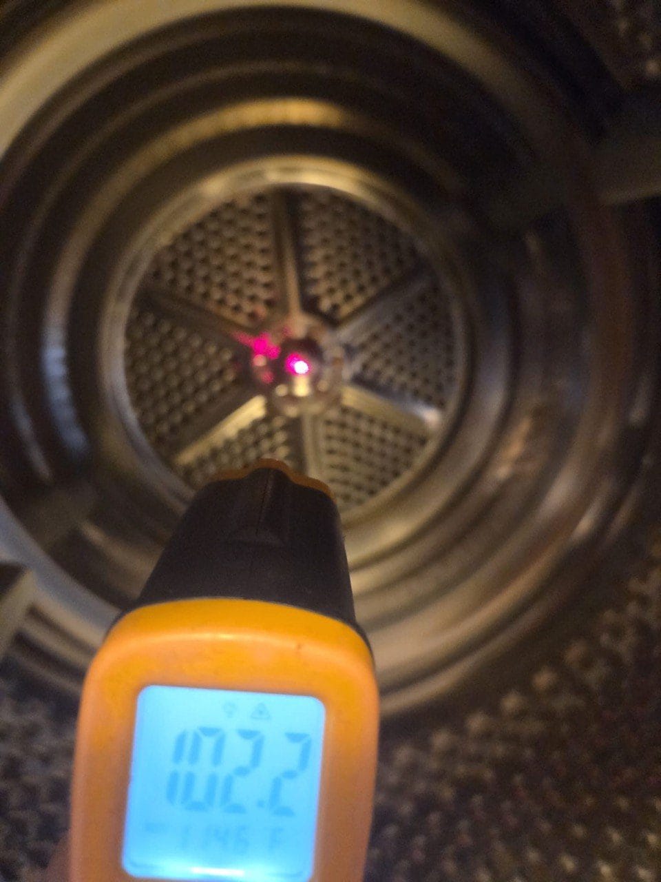 What we found: Our technician Daniel arrived on site and found that the dryer was indeed heating properly and rotating the drum, and seemed to intermittently stop after a few minutes. Before any disassembly, Daniel put the unit into diagnostic mode and checked the error code register for any codes. The register flashed the code tE1 which usually indicates a thermistor fault. Daniel disassembled the top cover and front fascia and bulk head, removing the drum and belt to expose the inner components. Then he tested both the blower housing thermistor and the outlet (exhaust) thermistor, both read resistance within range. So what could be the issue?