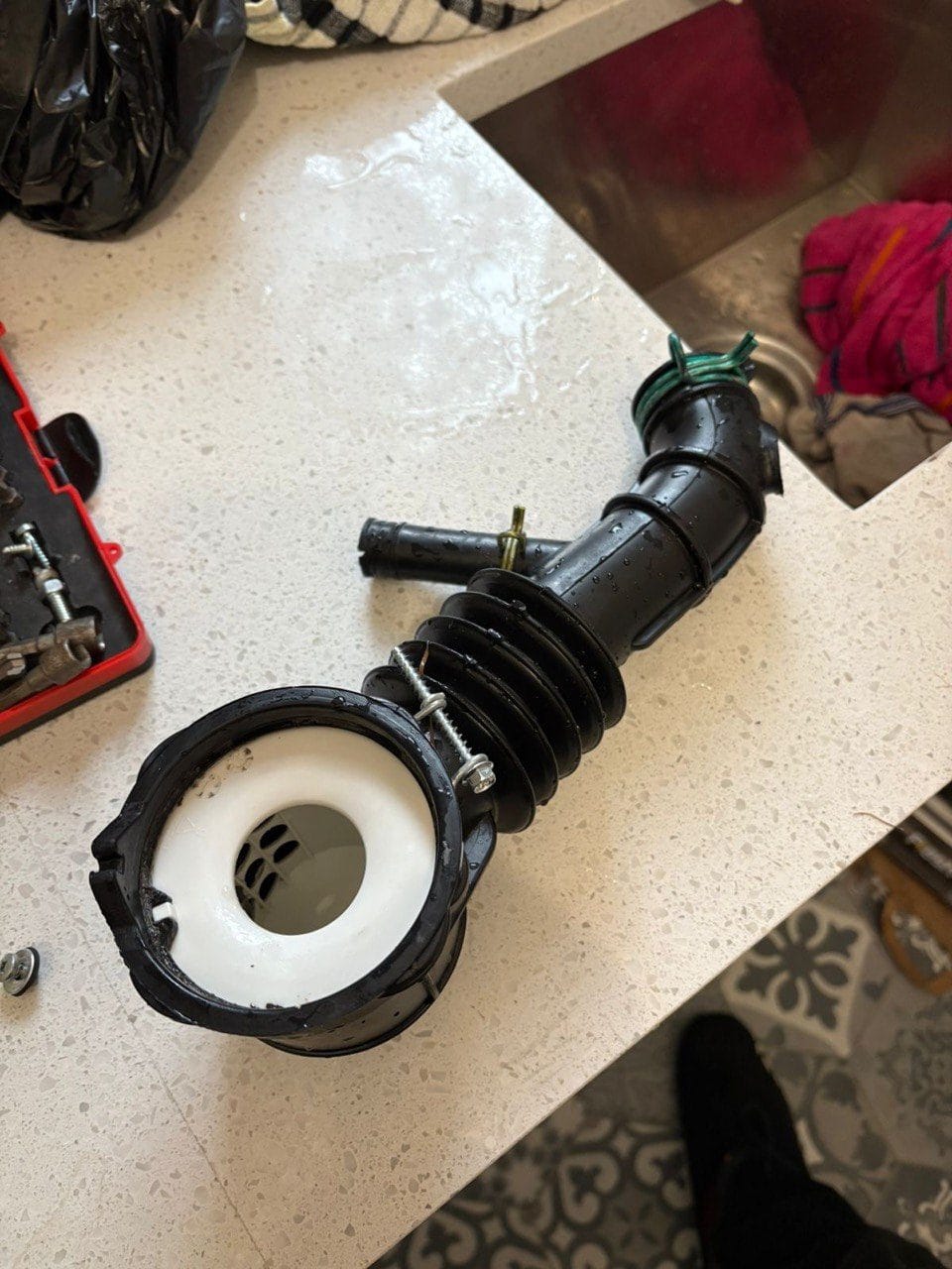 The problem: A property manager in Yaletown requested that we investigate a leaking older front-load Kenmore washer (made by Whirlpool). On arrival our technician Leon ran a test cycle and saw a fairly large but sporadic leak during the washing step. The leak wasn’t continuous and seemed to start and stop periodically, especially as the drum movement ramped up due to the weight of the load the client was washing.