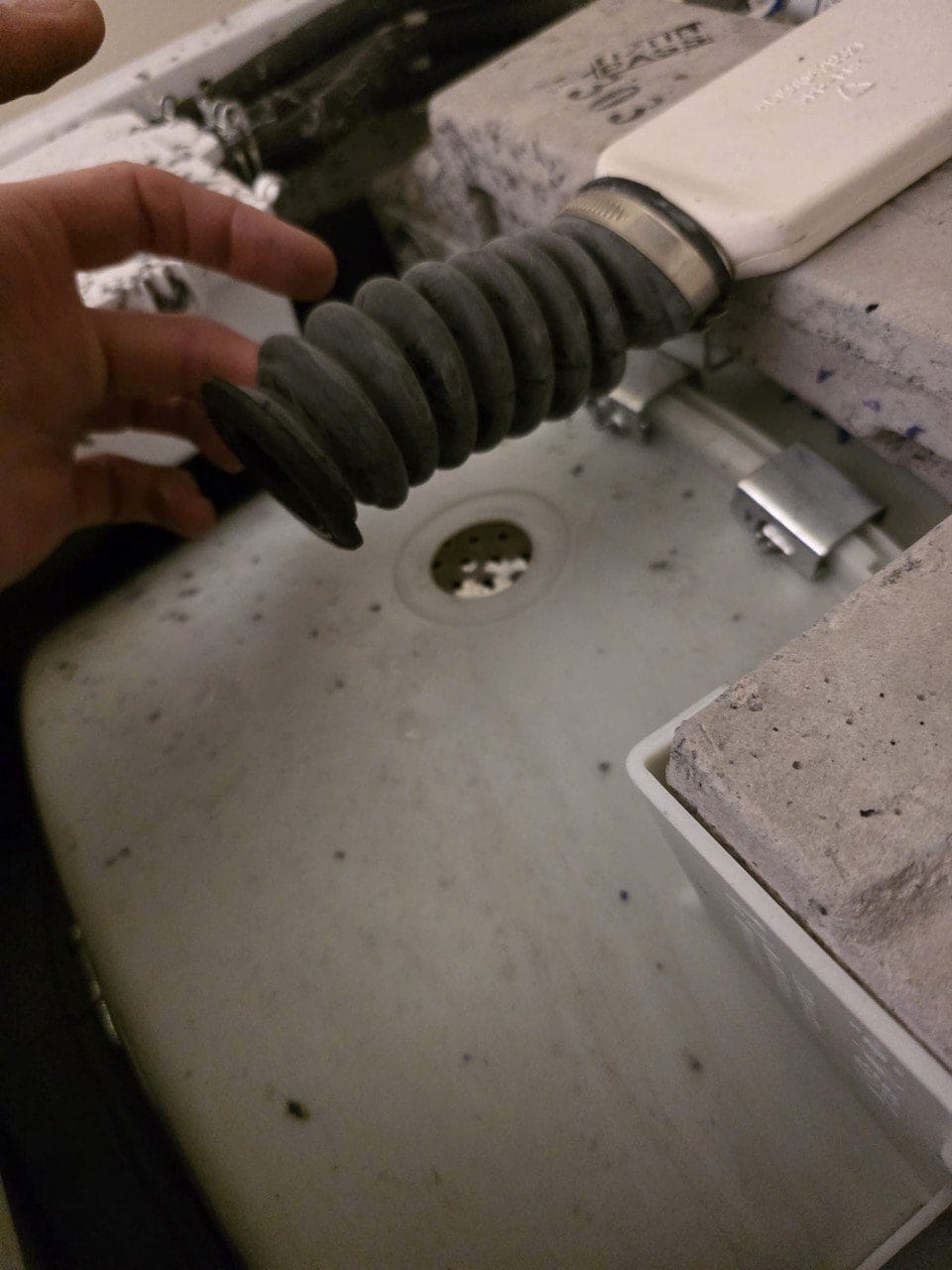 What we found: The rinse cycle filled without leaking, and most of the operation of the washing machine was leak-free. So where could this mystery leak come from? The technician inspected the rubber door gasket and did not find any tears. After taking off the front panel and door panel of the washing machine – he checked all hoses and connection points for leaks, as well as the drain valve and dispenser housing and all of them seemed to be leak free. There was also a slight streak of water on the cinder-block under where the lower part of the gasket sat. This meant the leak had to be coming from the rear groove of the gasket trim. With the gasket taken off, and inspected – there were still no tears or rips in the rubber. However, the ring clamp that the gasket was sitting on was a little loose. This often happens after years of heavy loads being ran in the washer, where the clamp and gasket gets pulled away because the front side is fixed to the outside of the washer, so as the drum moves around, the gasket gets yanked out of position and while it won’t usually snap off outright, it will create a little gap where water can seep through.